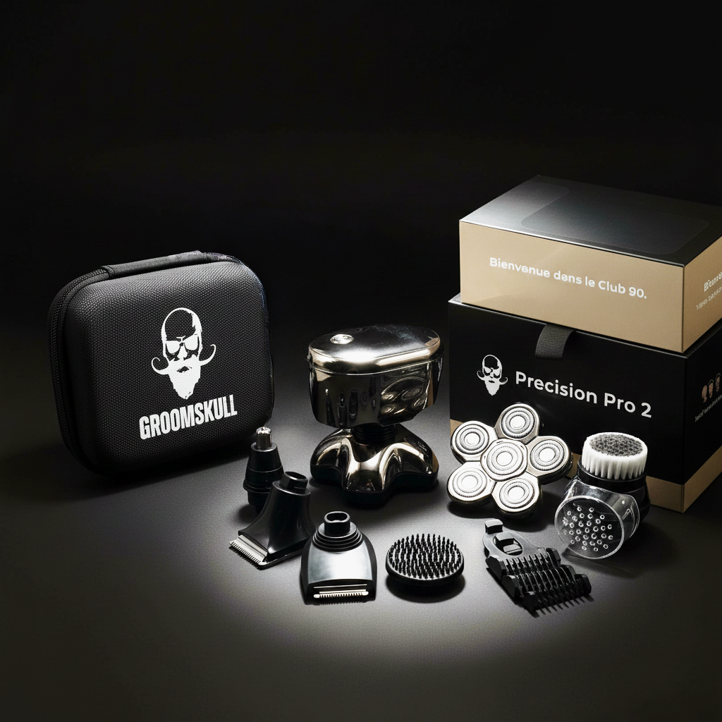"Imaginez-vous, mes camarades de style, le doux ronronnement du GroomSkull®. En quelques instants, vous brisez les chaînes du matin terne. Vous émergez, audacieux et impeccable. C'est votre rituel matinal de domination."