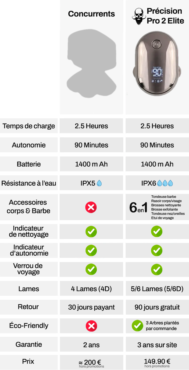 Dites adieu aux lames émoussées, aux irritations et aux coupures. Voici le rasoir électrique GroomSkull® Precision Pro 2, le joyau de la couronne des rasoirs électriques. Si vous rêvez d'un crâne glabre en quelques secondes, comme chez le Barbier , votre quête est terminée.